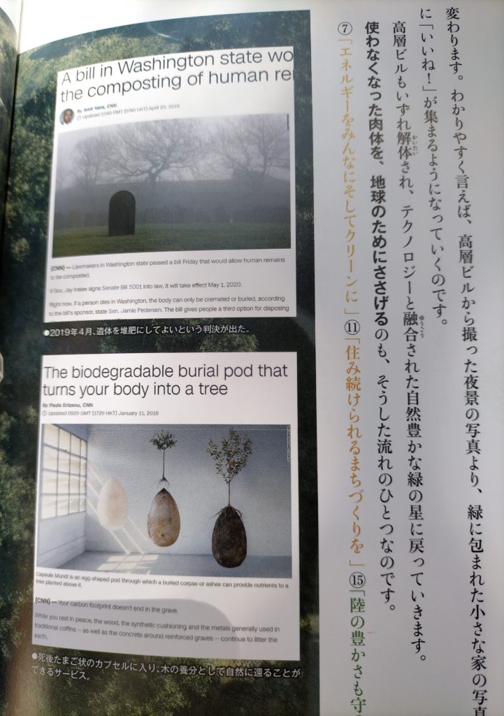 しかしそんなことは意に介さずこの本の核となるトランス・ヒューマニズムの話へと進む。それは人体と機械を融合させることによって人間の潜在能力を最大限引き出し、かつ永遠の命を手に入れることを可能にする技術だという。しかしこれについても読み進めると人間の誕生から死までをA.I.で統制管理して世界の総人口のうち60億人については脳の記憶をデータ化して宇宙船内のスーパーコンピューターに保存し、宇宙空間を漂わせるつもりらしい。それを「方舟」と呼び、SDGsと呼び、将来訪れる氷河期を回避するための人類救済計画だという。2019年にスイスで行われたビルダーバーグ会議でA.I.が決定したらしい。そして死体についても木の下に埋めて肥料とし、緑化に貢献するSDGs活動(殉教)だと称賛することが同年5月に米ワシントン州で人間の死体を肥料として利用する法案が成立、2030年より施行すると書かれている。 彼らはそのための戦争も正当化するだろうし、しかし死刑制度の拡充はやらないだろう。あくまでも犯罪者優遇政策は譲らない。