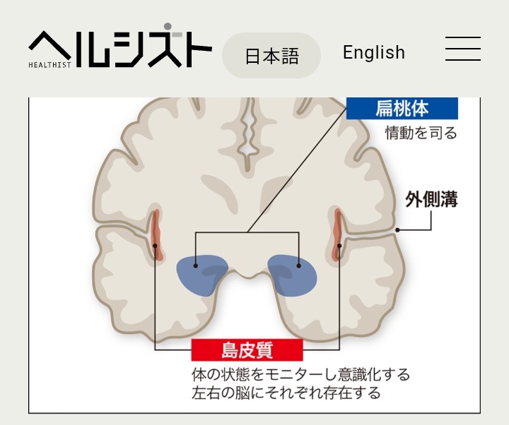島皮質―――大脳の左右の外側溝の奥に存在し、身体内部(内臓や消化器など)で起こる変化や痛みや体の位置感覚、そして感情などの情報を受け取って意識化し、それぞれの状況や刺激の強度に合わせた適切な反応を脳の各部位に指令することで心と体の連携を生み出している器官。左右の前部と後部それぞれに役割があり、前部は主に感情や意思決定にかかわる情報を意識化し、後部は身体内部からの感覚情報を意識化する。投射先は前頭葉(認知)、頭頂葉(注意)、側頭葉(言語、聴覚)、帯状回(前部および後部、感情と認知)、扁桃体(恐怖、不安、喜怒哀楽)、視床(情報伝達)があります。