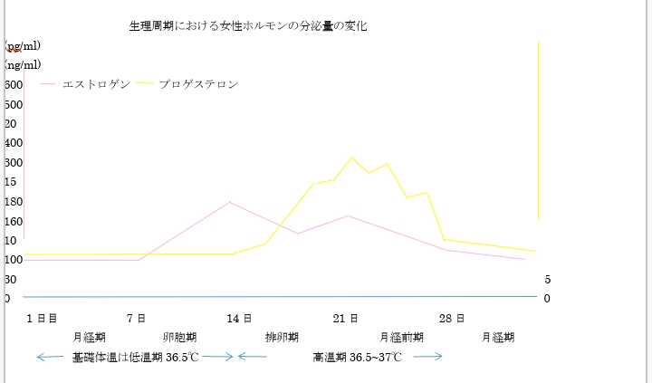月経期のエストロゲン分泌量は10~50pg/ml(ピコグラム、一兆分の一)、プロゲステロン分泌量は1ng/ml以下(ナノグラム、十億分の一)。