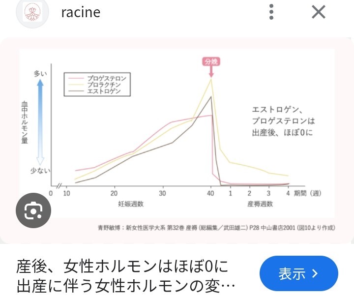 ※ちなみにエストロゲンが生成を促進してきたセロトニンも筋肉の緊張を適切に維持する働きがあり、不足すると緊張が低下して姿勢や表情の維持にも影響を与えます。黄体期に一時エストロゲンの再分泌がみられるのは恐らくセロトニンの鎮痛作用にブーストをかけるためで妊婦のエストロゲン地が出産に伴って急激に減少してほとんどゼロになるのも出産に伴う痛みを鎮痛するために使われているのだと推測します。(妊娠八か月以降16,500~32,400pg/mlから0に。人体は麻酔薬の存在を想定していませんし、それが発見される前から女性たちは子を産んでいました) さらに足りないエストロゲンを補うために男性ホルモンであるアンドロゲンアロマターゼという酵素の働きでエストロゲンに変換して動員をかけるのですが(更年期女性のエストロゲン補給の要でもある)、プロラクチンや運動不足、また過度な運動やストレスによってこの酵素の活動が低下すると男性ホルモンが増えることになりニキビや肌のテカリ、べたつき、吹き出物の原因になります。それから月経舞うから月経期の残りの不快症状である下腹部痛、乳房痛、腰痛などもセロトニンの鎮痛作用が切れたせいと考えられます。―――ちなみにアロマターゼの活性化にはホップエキス、加齢、肥満、、インスリン、ゴナドトロピン(つまり生理周期の再開)、アルコール摂取が有効とされています。