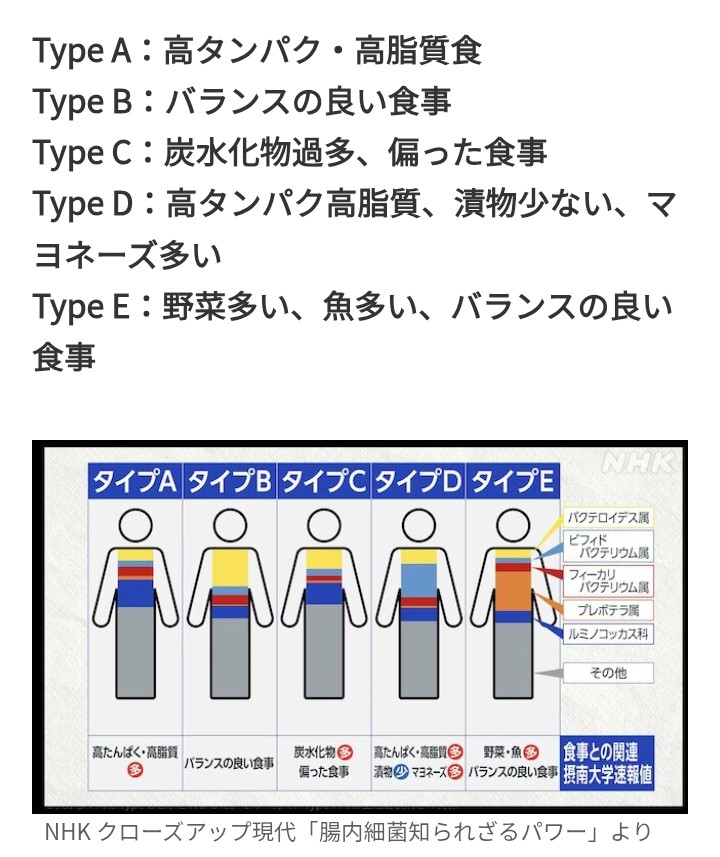 ・タイプEは魚と野菜中心のバランスの取れた食生活によって作られた腸内フローラで最も健康的な状態と評価されています。特にこのタイプでのみ増殖が確認できるプレボテラ菌はお米を長期的な食べている人の腸内に定着する日和見菌ですがアジア人でも20~30%の人にしか保菌していないようです。嫌気性菌の中でも特に酸素に弱く、空気に触れさせると10~30分で死滅してしまいます。つうじょうは炭水化物や食物繊維をエサとして善玉菌と同じような働きをしていますが、例によって腸内環境が悪化すると一部の菌種が口腔内で歯周病を引き起こしたり膣内で膣炎を引き起こしたり、心血管疾患リスを高めるトリメチルアミンNオキシド(TMAO)の生成に関与したりします。・・・これだけで「最も健康的」と評価するのは根拠に乏しいように思えますが日和見菌の割合が高く、かつルミノコッカス属が少ないこと、そして腸内に余剰の酸素(すなわち炎症)をもたらさないことが健康維持の条件として強いのかもしれません。魚をたくさん食べることとプレボテラ菌のシェア拡大の関連もはっきりせず、酪酸酸性菌やビフィズス菌、乳酸菌、アッカーマンシアなどの善玉菌が良質なたんぱく質やオメガ3脂肪酸をエネルギーとして増殖し、さらに抗炎症作用に利用しているようです。・・・良質なたんぱく質とは白身魚や白身肉を指し、スケソウダラ、カレイ、ヒラメ、スズキ、鯛、甘鯛、鶏むね肉、鶏ささみなどが含まれますが、アミノ酸スコアが100に近く、必須アミノ酸をバランスよく含んでいること、他の栄養素(ビタミン群やD、ミネラル)も豊富でカルシウムの吸収やエネルギーおよび脂質代謝を助けること、高タンパク質食品であるにもかかわらず脂肪分が非常に少ないこと(マダラの場合100g中0.2g)、筋線維が細く、筋基質たんぱく質(コラーゲン)が少ないために胃腸への負担が少なくトレーニング後や高齢者や病人など腸の働きが弱っている時の栄養摂取に適していることなどからそう呼ばれています。加えてタンパク質は未消化のまま大腸まで運ばれてしまうと悪玉菌によって腐敗されてアンモニアや硫化水素を作られてしまいますが、消化が良い白身肉ならそれを防ぐことができます。乳酸菌などは分解されたたんぱく質やアミノ酸の一部を利用して腸内環境を弱酸性~中性(pH6.0~7.5)に保っています。ちなみにこれが酸性に傾くと下痢になり、アルカリ性に傾くと便秘になる(便の色が黒っぽくなる)そうです。